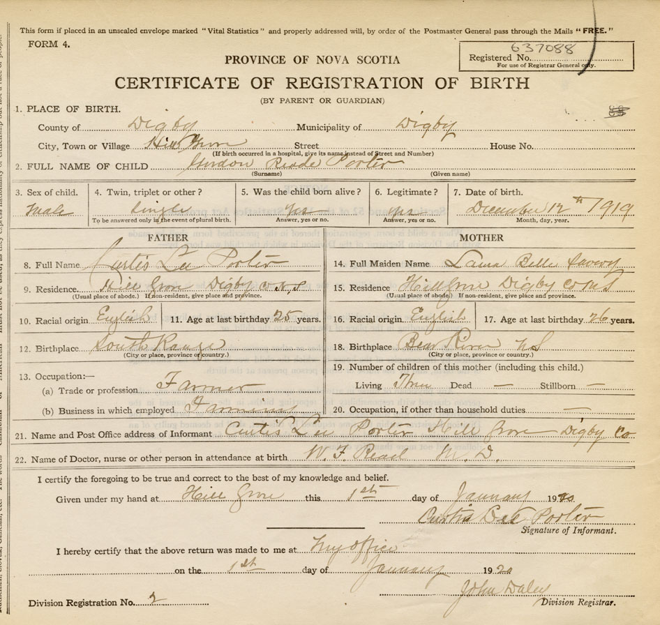 21. Name and Post Office address of Informant Curtis Lee Porter Hill Grove, Digby Co., NS