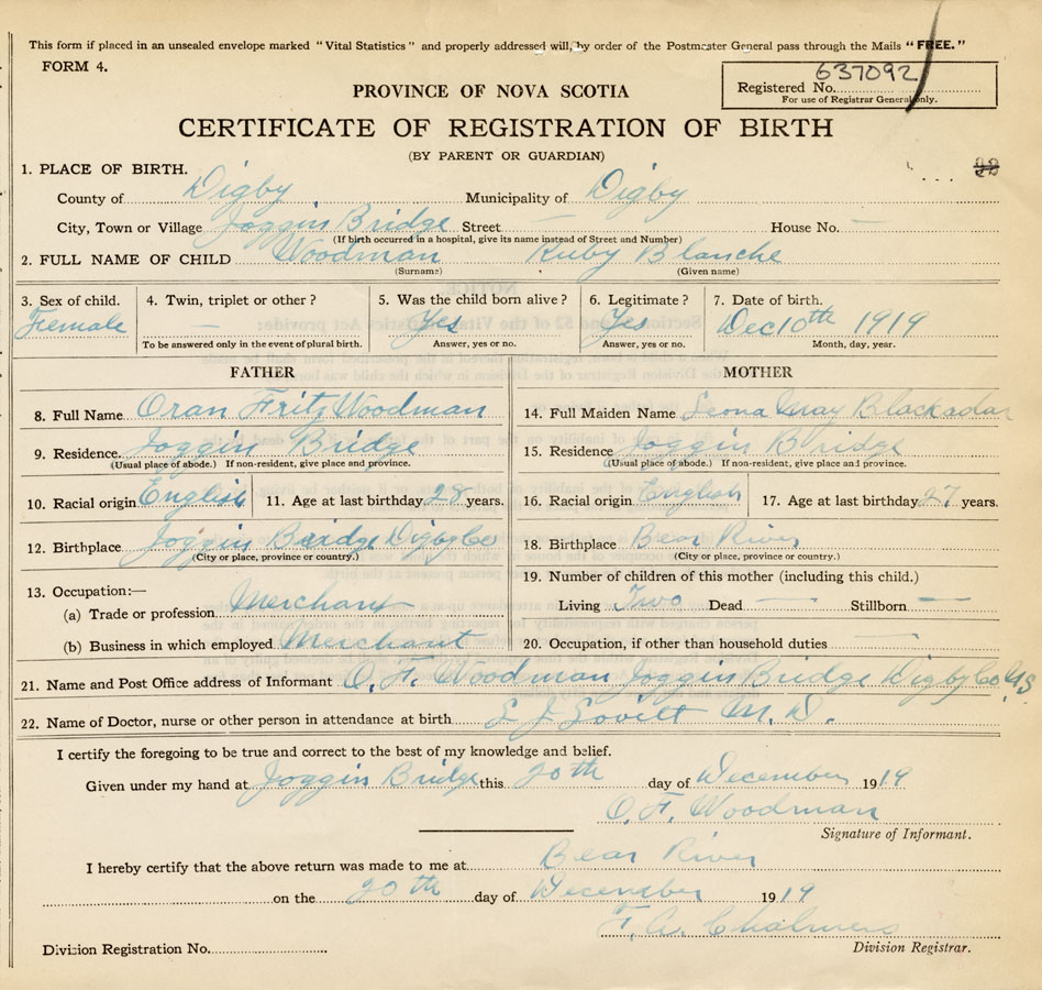 21. Name and Post Office address of Informant O. F. Woodman Joggins Bridge, Digby Co., NS