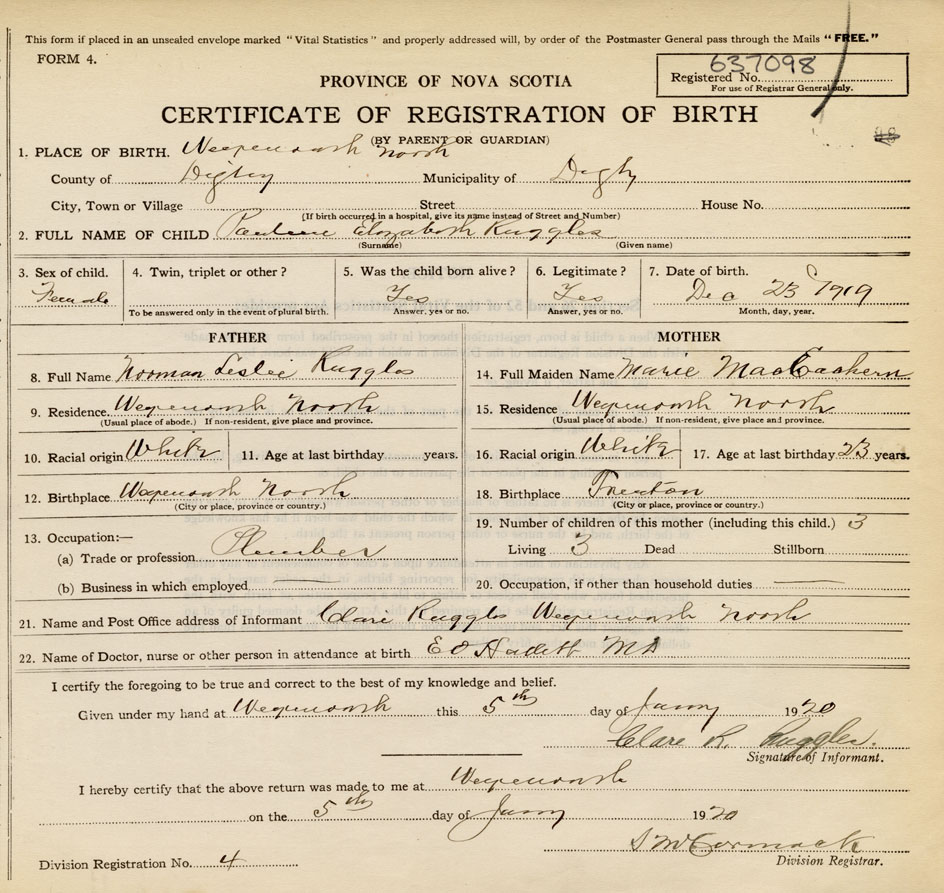 21. Name and Post Office address of Informant Clare Ruggles Weymouth North, Digby Co., NS