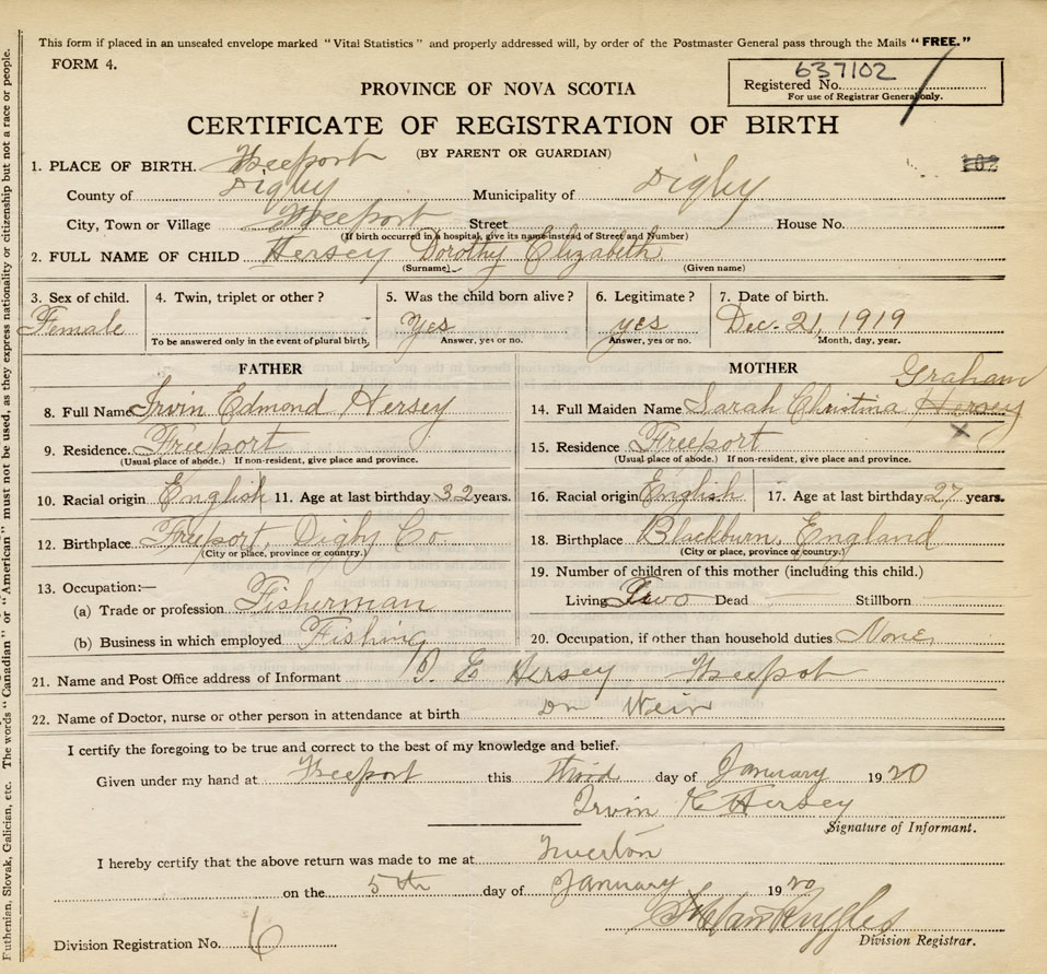 21. Name and Post Office address of Informant I. E. Hersey Freeport, Digby Co., NS