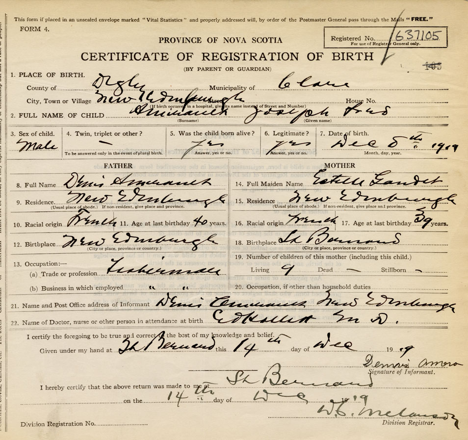 21. Name and Post Office address of Informant Denis Amirault New Edinburgh, Digby Co., NS