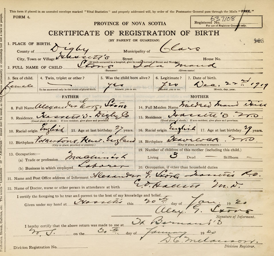21. Name and Post Office address of Informant Alexander G. Stone Hassett, Digby Co., NS