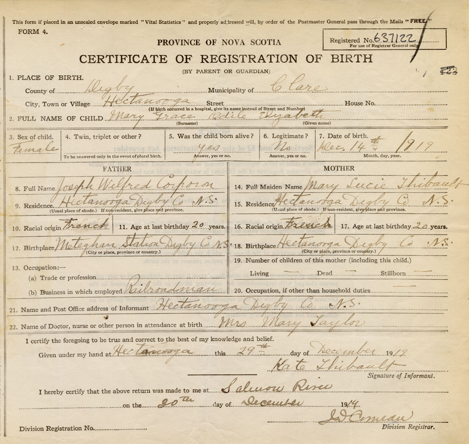 18. Birthplace Hectanooga, Digby Co., NS