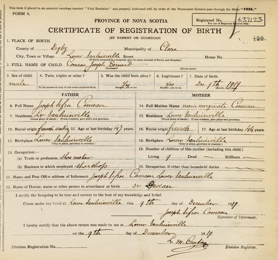 21. Name and Post Office address of Informant Joseph Sifroi Comeau Lower Saulnierville, Digby Co., NS