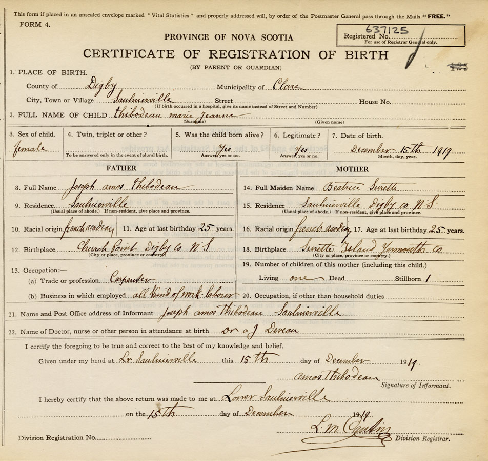 21. Name and Post Office address of Informant Joseph Amos Thibodeau Saulnierville, Digby Co., NS
