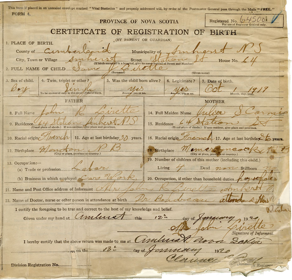 Date of Birth October 1, 1919 Place of Birth AmherstCounty of Cumberland