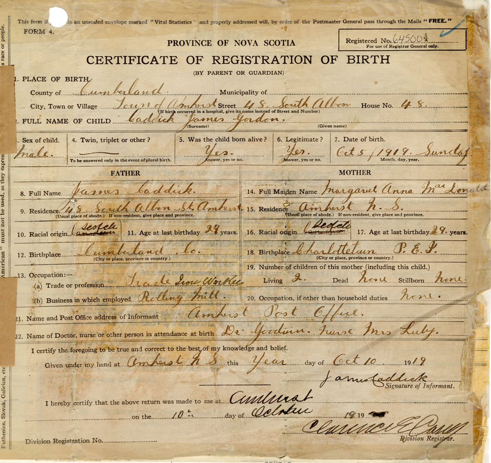 Name of Father James Caddick MAIDEN NAME of Mother Margaret Anna MacDonald
