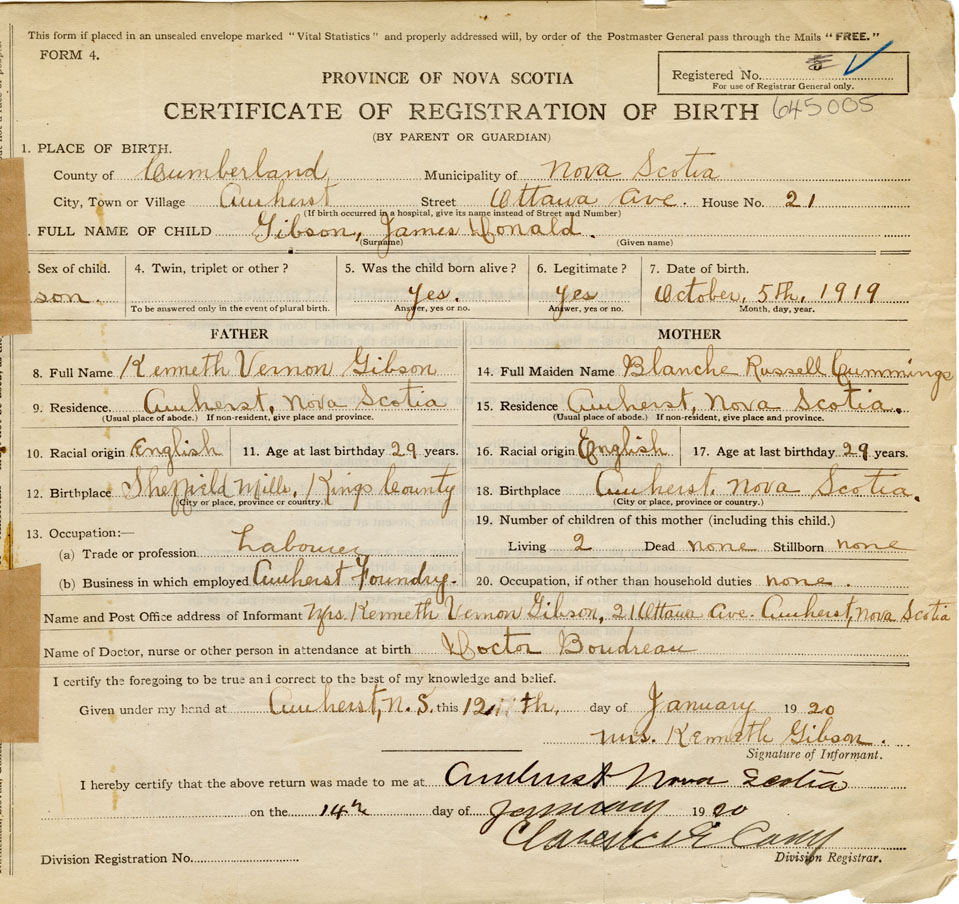 born at Amherst Cumberland County on October 5, 1919