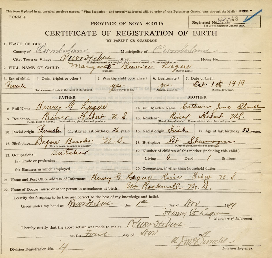 Date of Birth October 1, 1919 Place of Birth River HebertCounty of Cumberland
