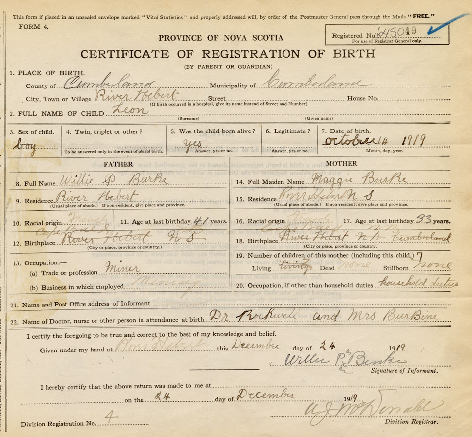 born at River Hebert Cumberland County on October 14, 1919