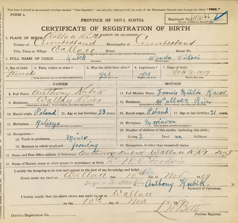 I hereby make application for the Registration of Birth of Wanda VictoriaKubik Sex Female