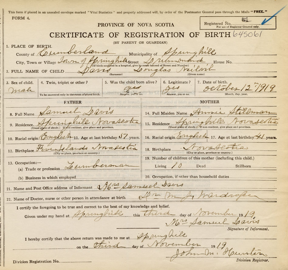 born at Springhill Cumberland County on October 12, 1919