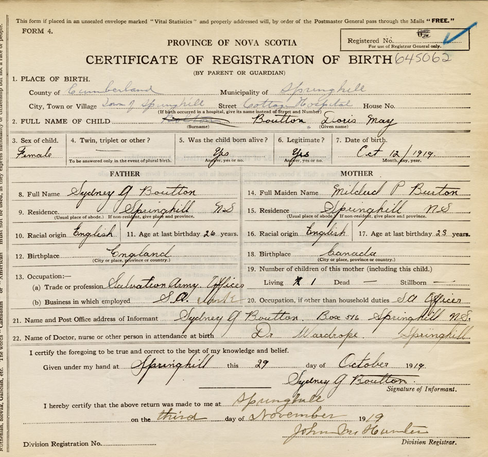 born at Springhill Cumberland County on October 12, 1919