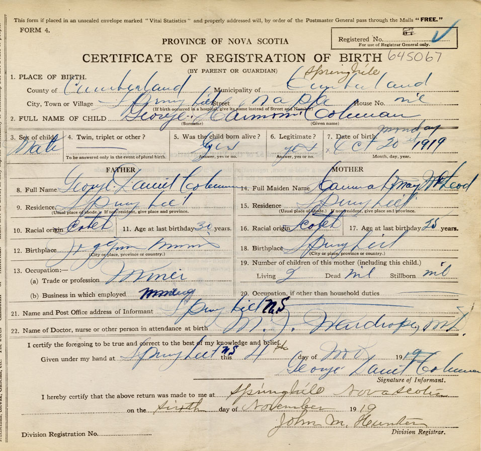 born at Springhill Cumberland County on October 20, 1919