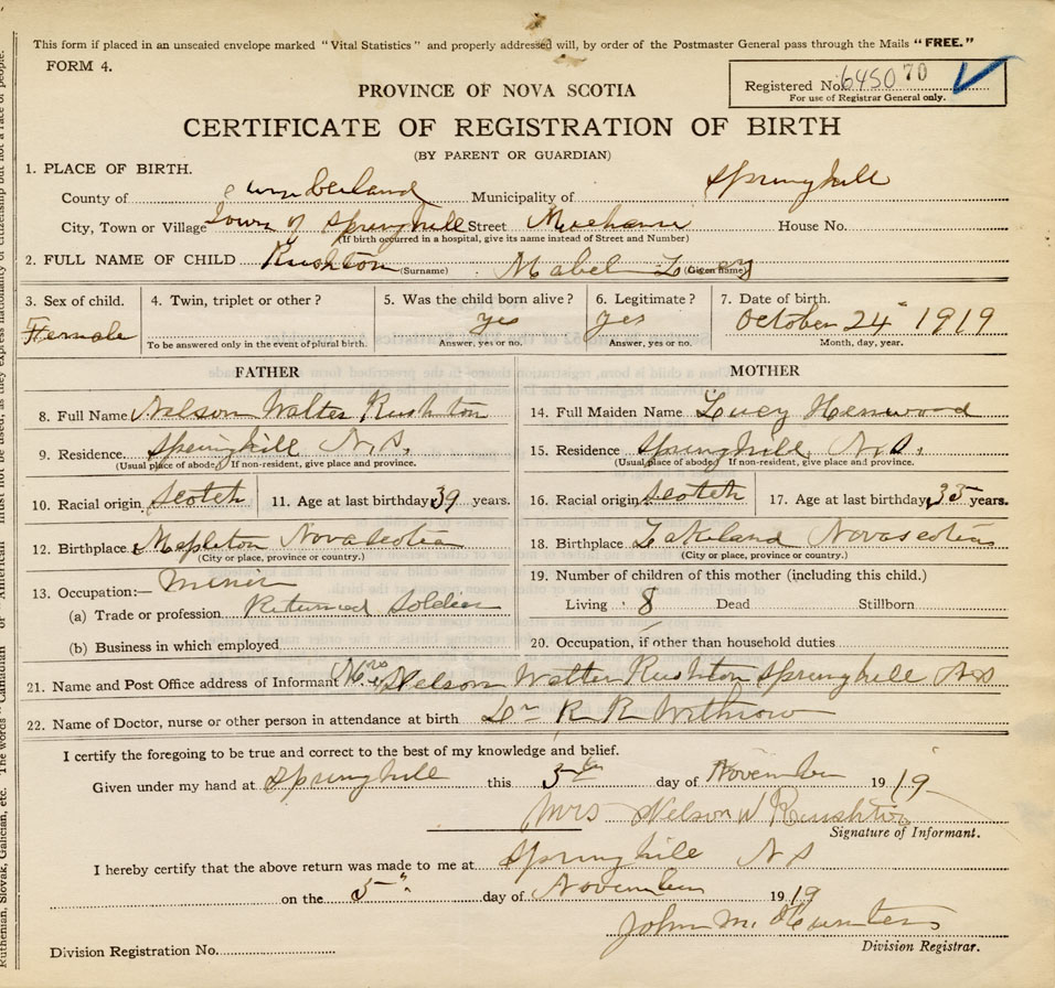 born at Springhill Cumberland County on October 24, 1919