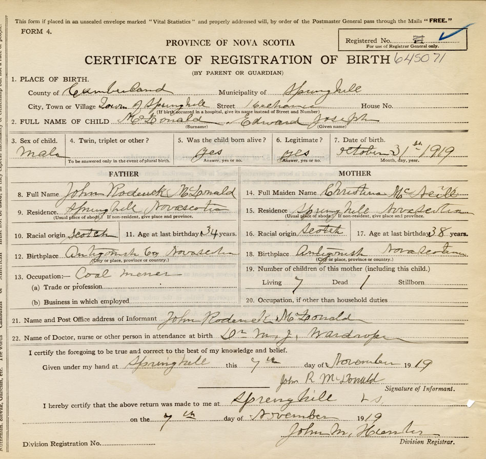 born at Springhill Cumberland County on October 31, 1919