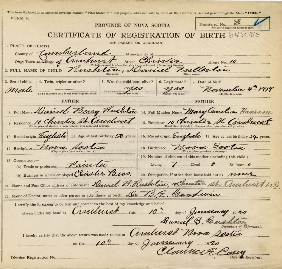 born at Amherst Cumberland County on November 4, 1919