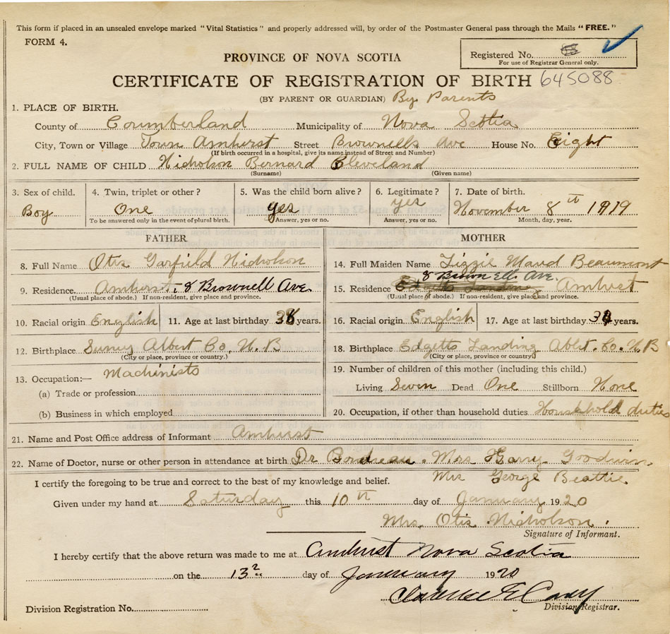 born at Amherst Cumberland County on November 8, 1919