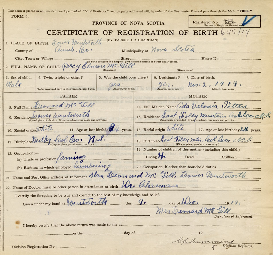 Date of Birth November 2, 1919 Place of Birth Lower WentworthCounty of Cumberland