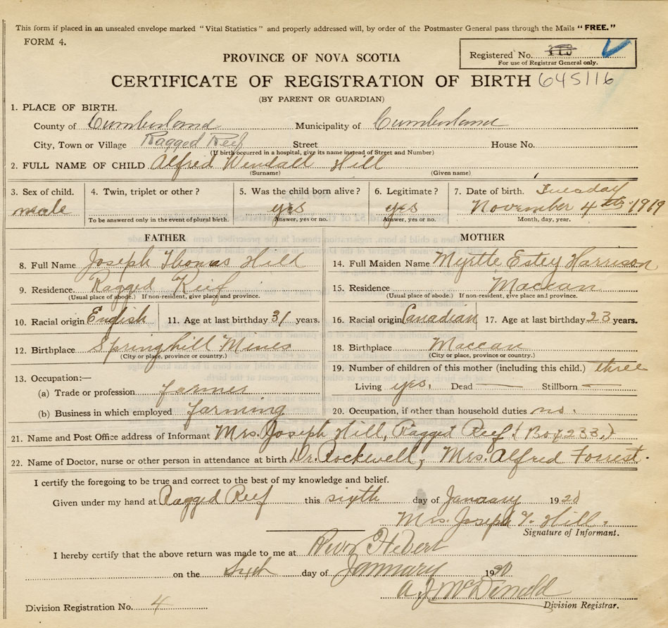 Occupation of Father at Birth of child Farmer Place of birth of Father Springhill Mines