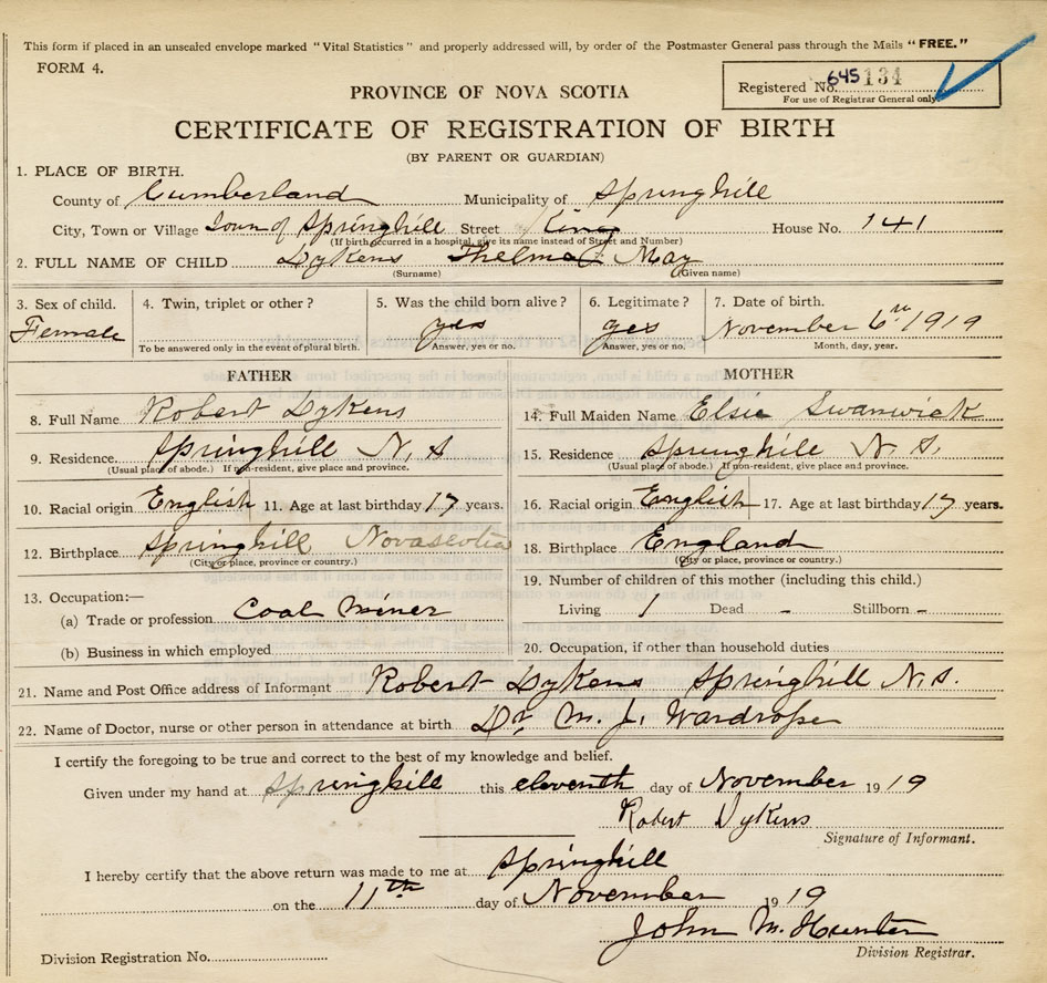 born at Springhill Cumberland County on November 6, 1919