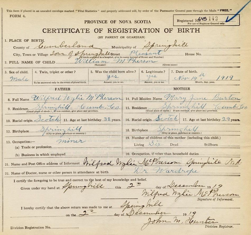 Date of Birth November 14, 1919 Place of Birth SpringhillCounty of Cumberland