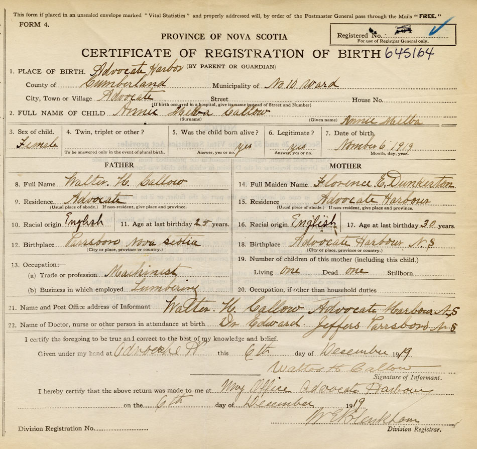 Date of Birth November 6, 1919 Place of Birth Advocate HarbourCounty of Cumberland