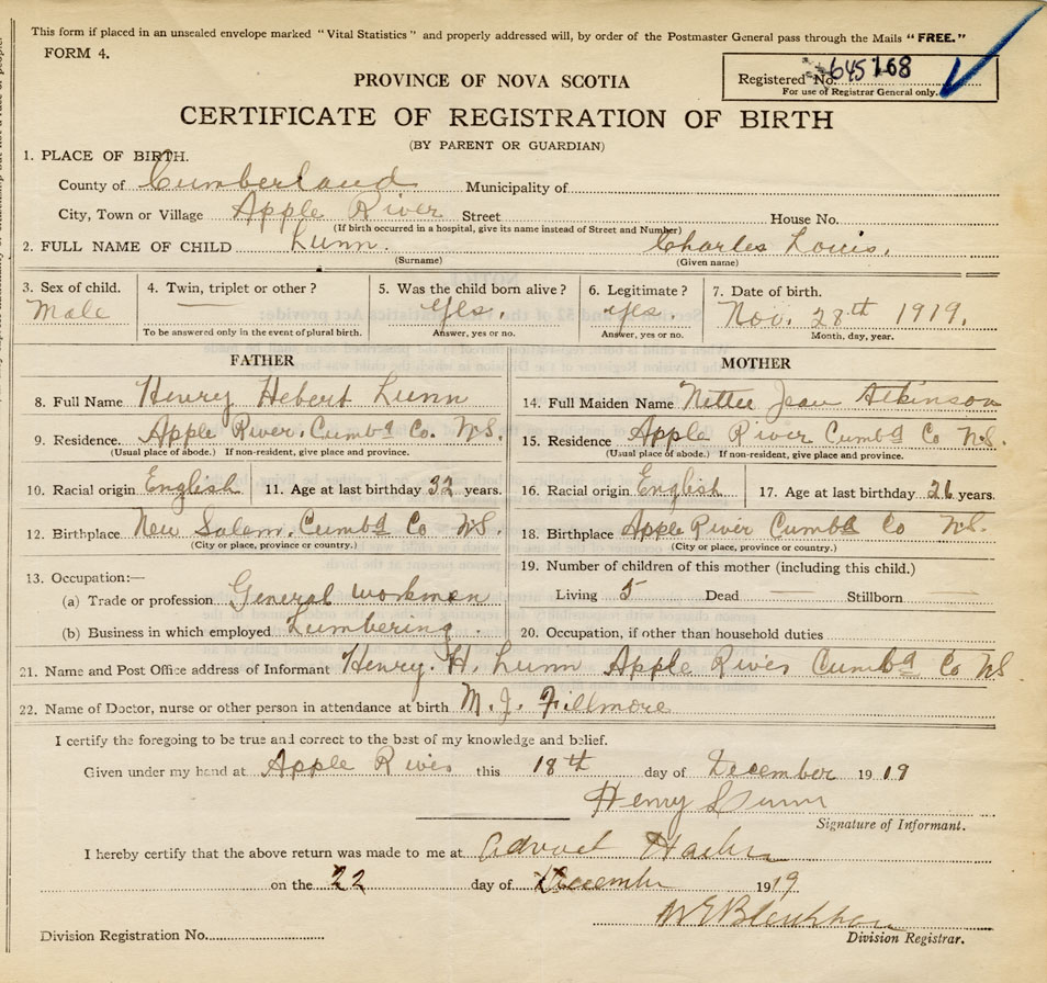 Date of Birth November 28, 1919 Place of Birth Apple RiverCounty of Cumberland