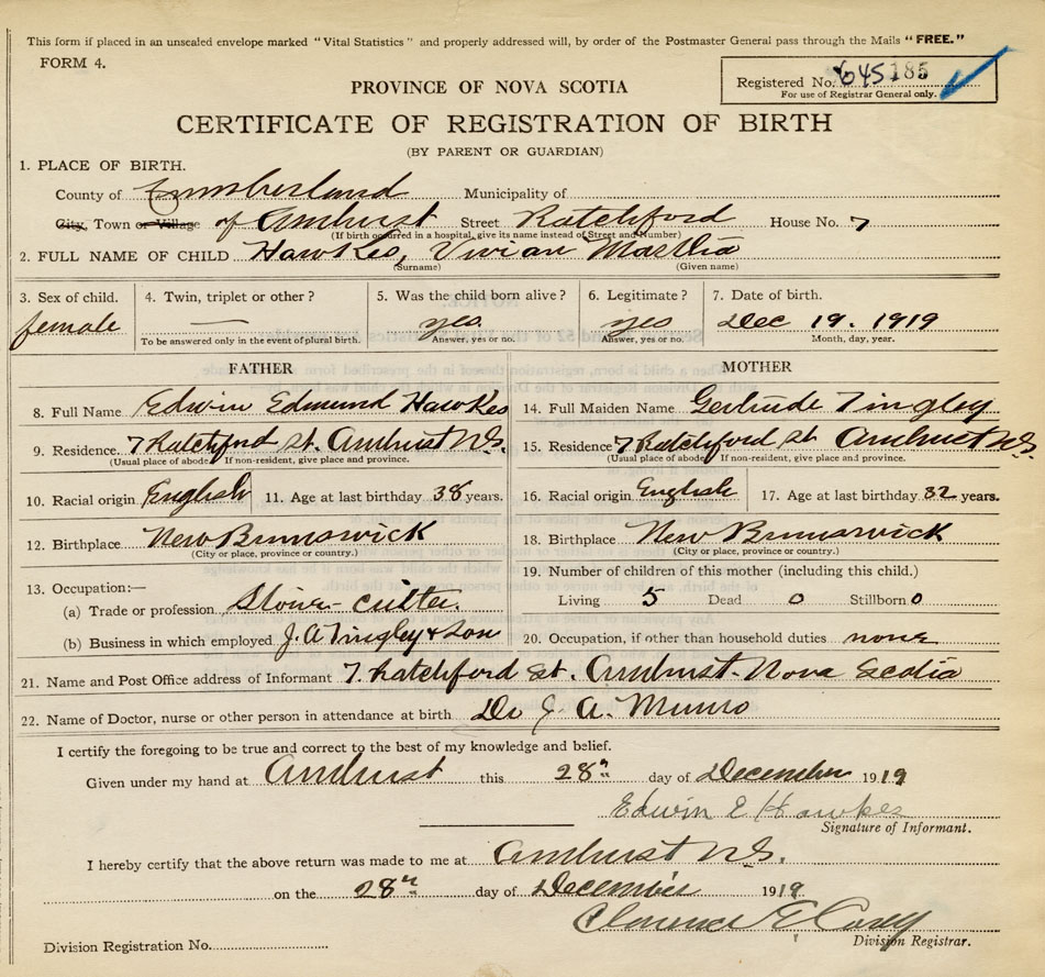 Date of Birth December 19, 1919 Place of Birth AmherstCounty of Cumberland