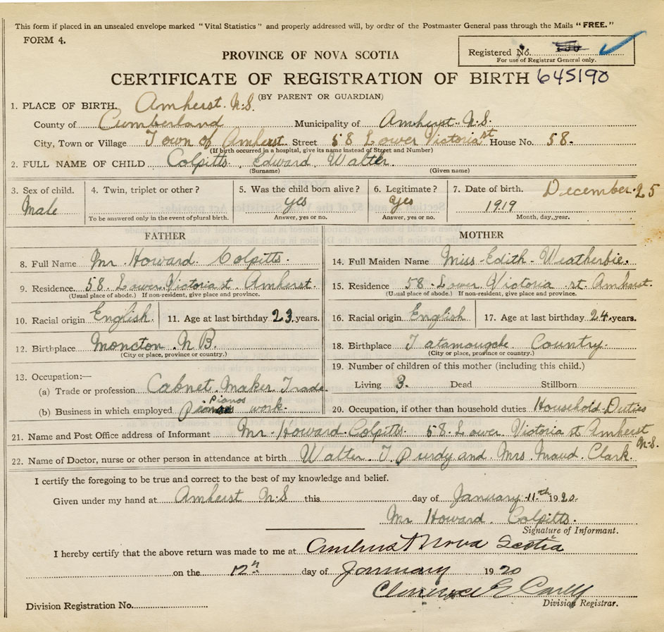 Name of Father Howard Colpitts MAIDEN NAME of Mother Edith Weatherbie