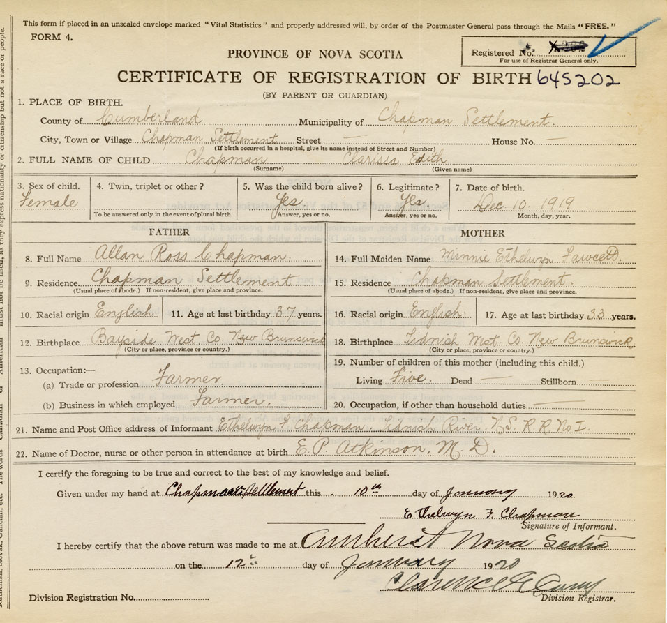 Date of Birth December 10, 1919 Place of Birth Chapman SettlementCounty of Cumberland