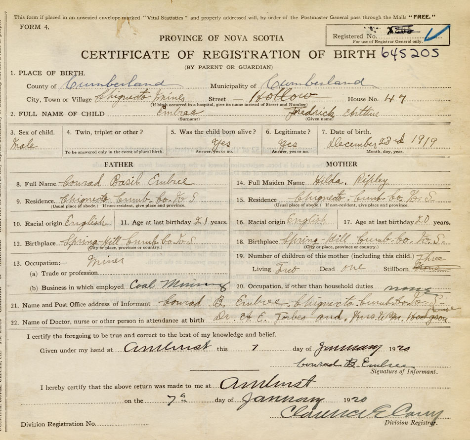 born at Chignecto Mines Cumberland County on December 23, 1919