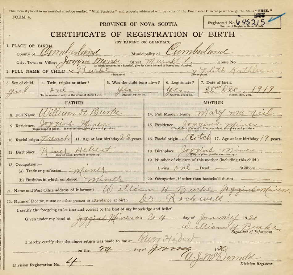 Date of Birth December 22, 1919 Place of Birth Joggins MinesCounty of Cumberland