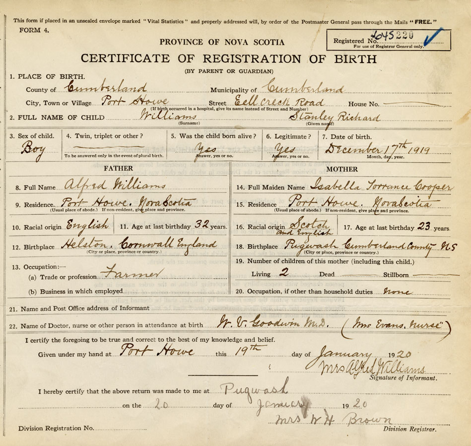 Date of Birth December 17, 1919 Place of Birth Port HoweCounty of Cumberland