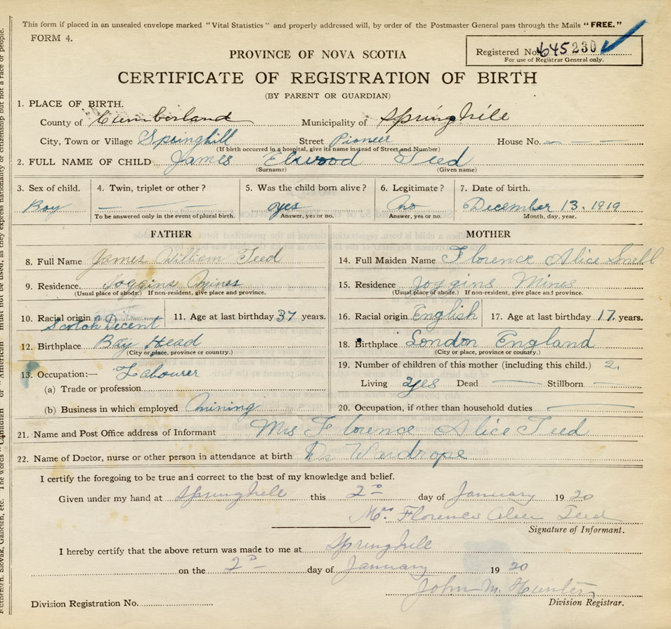born at Springhill Cumberland County on December 13, 1919