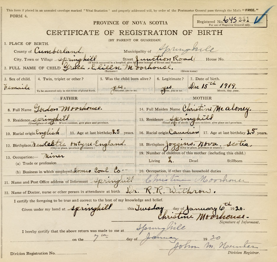 born at Springhill Cumberland County on December 15, 1919