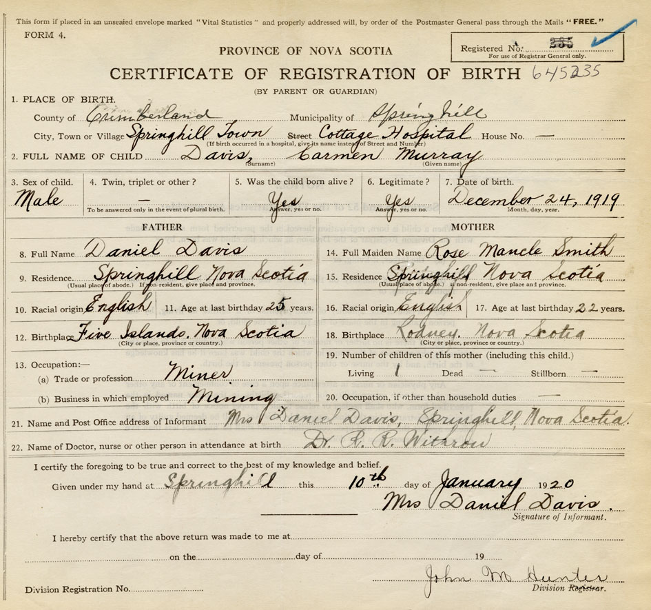 born at Springhill Cumberland County on December 24, 1919