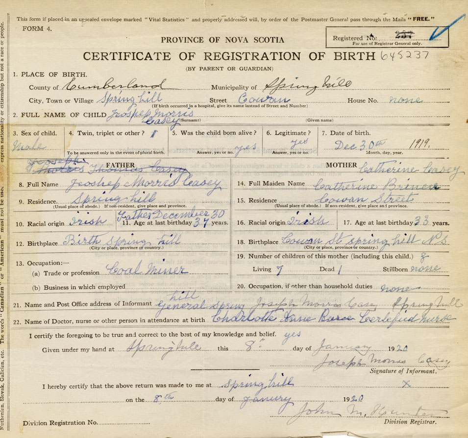 Occupation of Father at Birth of child Coal miner Place of birth of Father Springhill