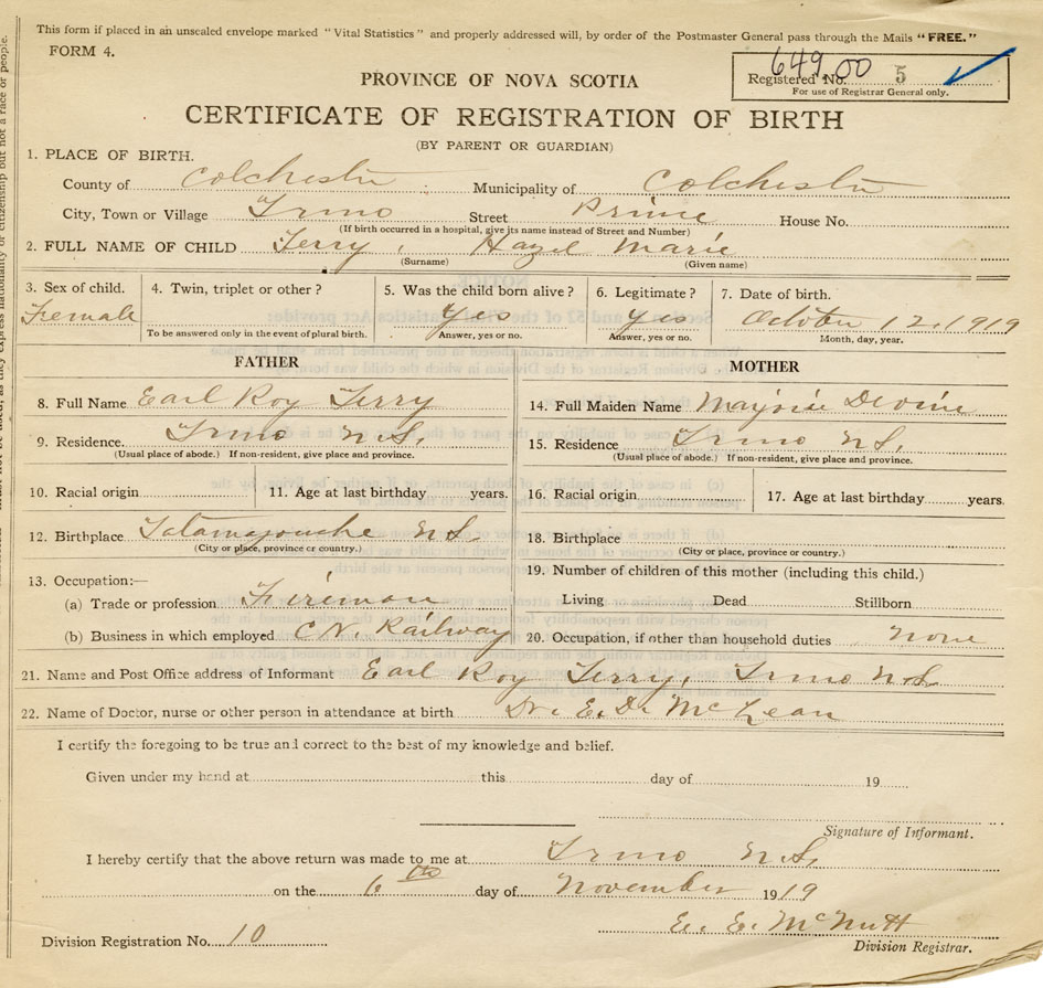 21. Name and Post Office address of Informant Earl Roy Terry Truro, Colchester Co., NS