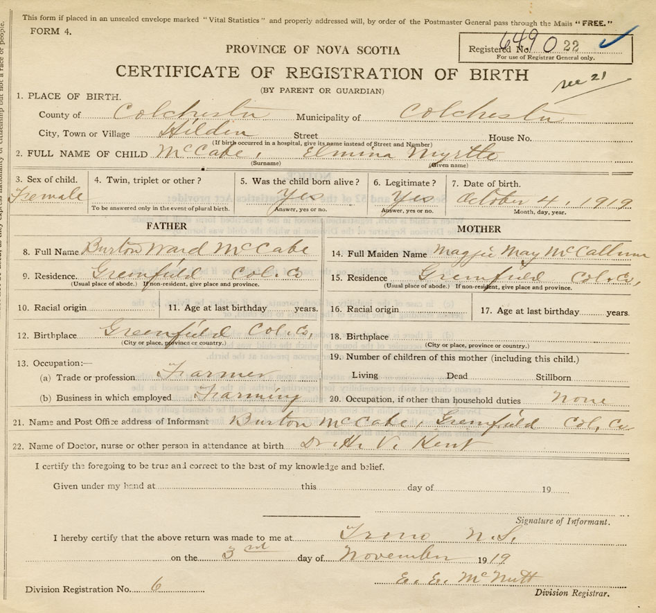 21. Name and Post Office address of Informant Burton McCabe Greenfield, Colchester Co., NS
