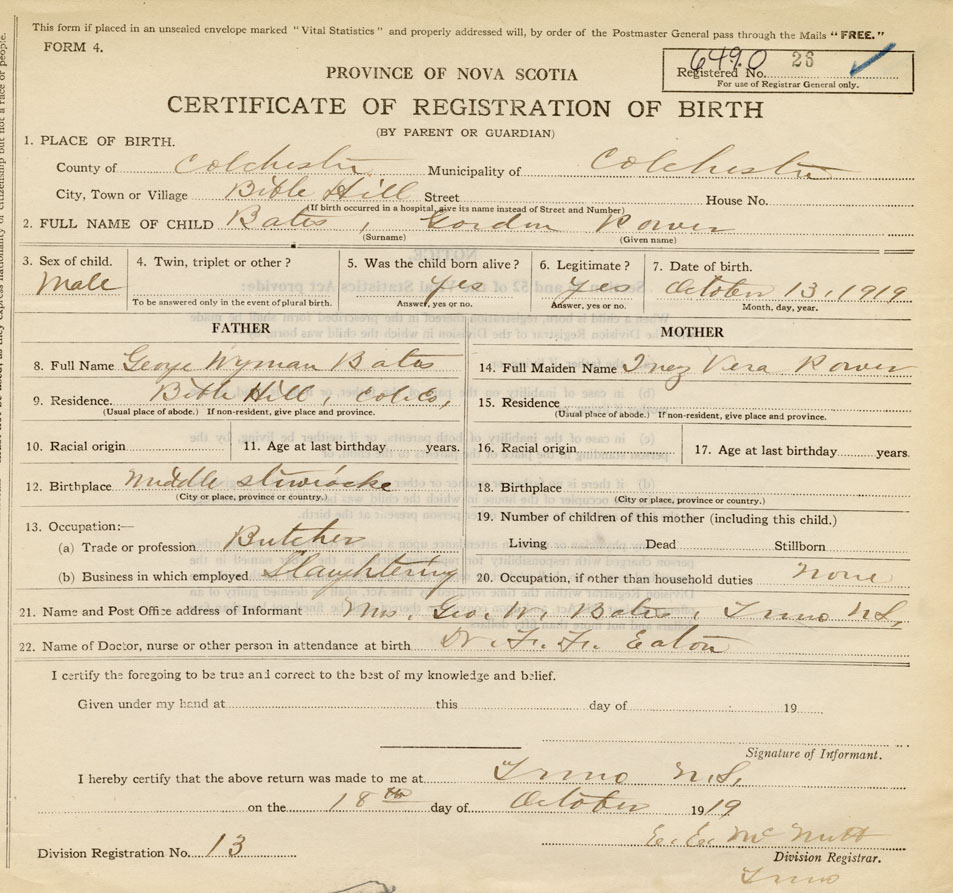 21. Name and Post Office address of Informant Mrs. George W. Bates Truro, Colchester Co., NS
