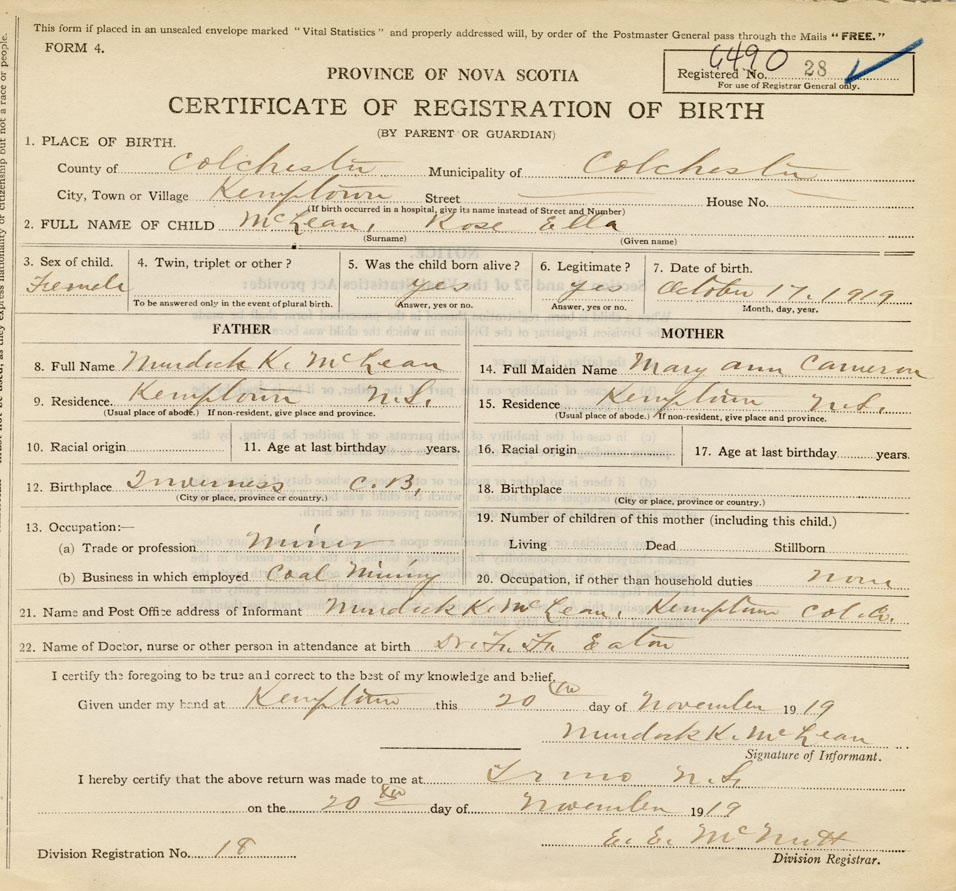 21. Name and Post Office address of Informant Murdock K. McLean Kemptown, Colchester Co., NS