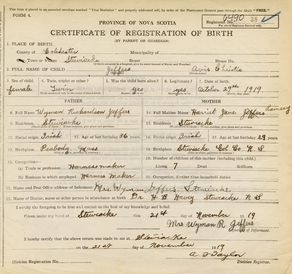 21. Name and Post Office address of Informant Mrs. Wyman Jeffers Stewiacke, Colchester Co., NS