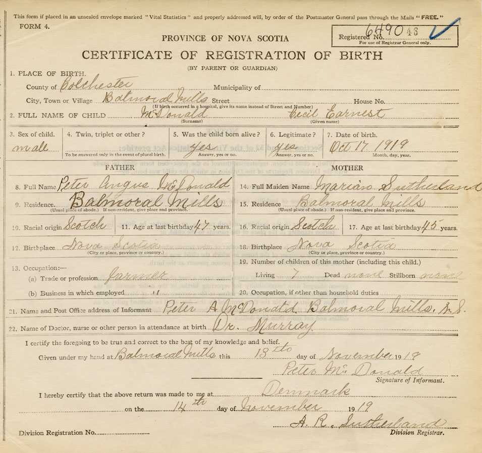21. Name and Post Office address of Informant Peter A. McDonald Balmoral Mills, Colchester Co., NS