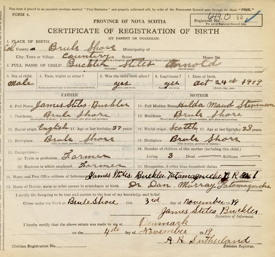 21. Name and Post Office address of Informant James Stiles Buckler RR #1, Tatamagouche, Colchester Co., NS