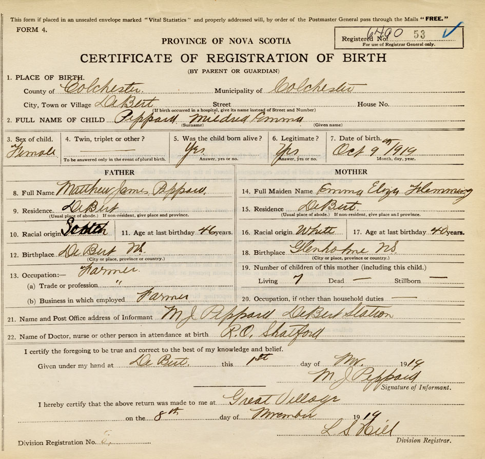 21. Name and Post Office address of Informant M. J. Peppard Debert, Colchester Co., NS