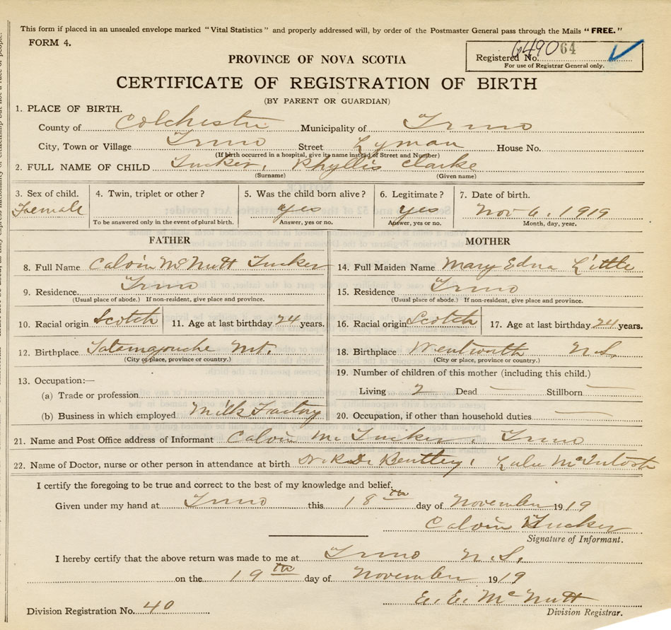 21. Name and Post Office address of Informant Calvin M. Tucker Truro, Colchester Co., NS