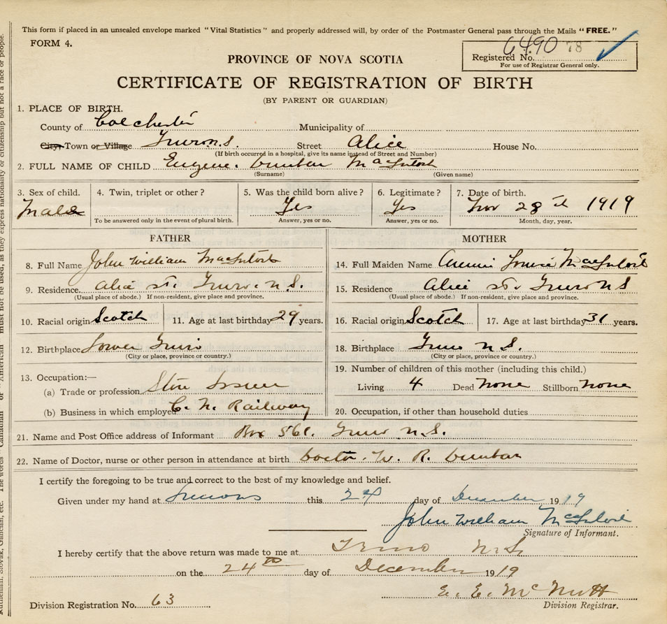 18. Birthplace Truro, Colchester Co., NS