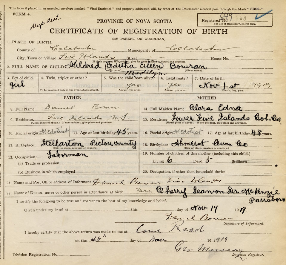 21. Name and Post Office address of Informant Daniel Bowren Five Islands, Colchester Co., NS