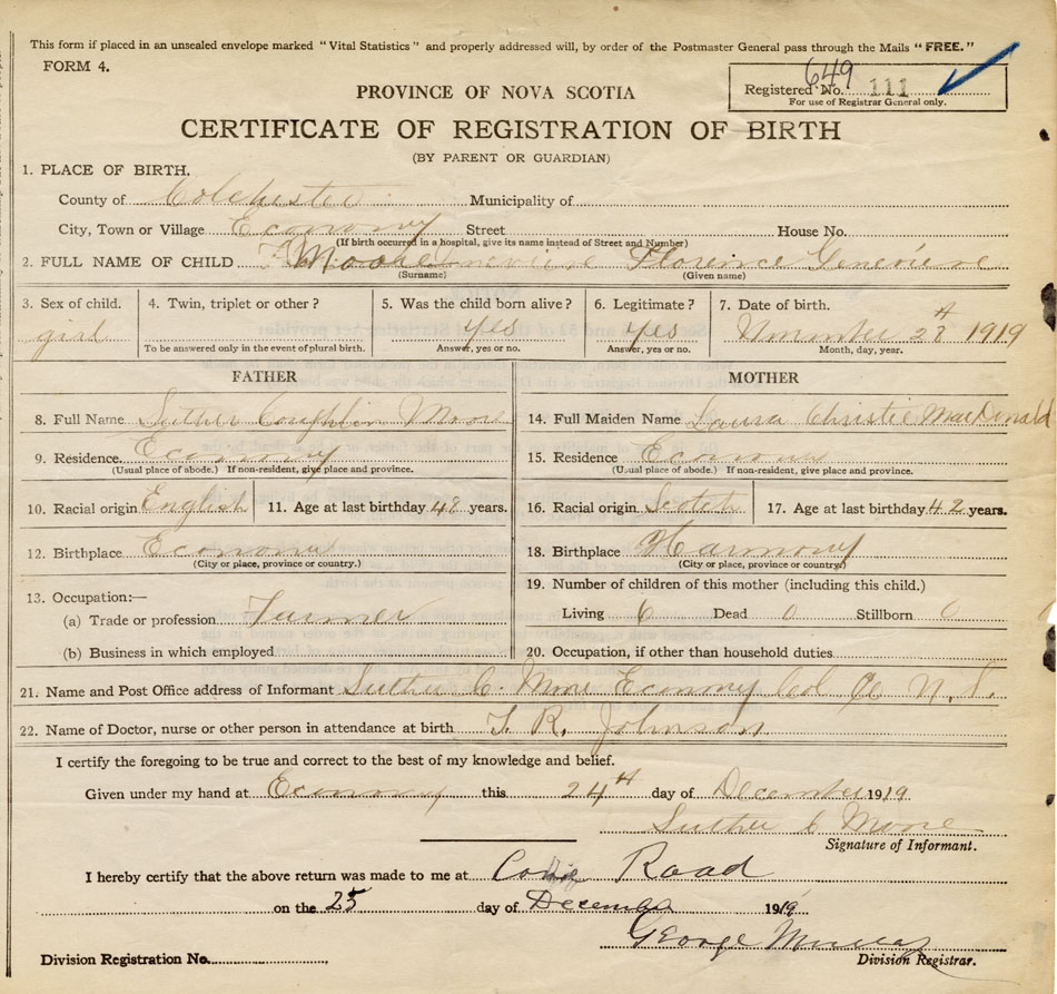 21. Name and Post Office address of Informant Suther C. Moore Economy, Colchester Co., NS